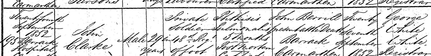 Death Certificate of Private John Clarke.48th Regiment of Foot. 1852 aged29.