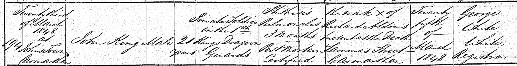 Private John King had arrived in Carmarthen in the Autumn of 1847 with a detachment from his Regiment – the famous King’s Dragoon Guards and were stationed in Johnstown in a makeshift camp, full of tents, horses etc. At the end of December 1847 he contracted what is now known as tuberculosis and died three months later in March 1848 aged just 21 years old as can be seen from his death certificate. Also, to give you a wider picture of the suffering, a further two death certificates are published here of two more Private  soldiers both dying from the same disease .In actual fact between 1847 and 1855 the  number of deaths from TB run into three figures. It therefore stands to reason that St David’s Cemetery contains one of the largest number of burials of servicemen anywhere in the United Kingdom with at approximately 50 different Regiments being represented.