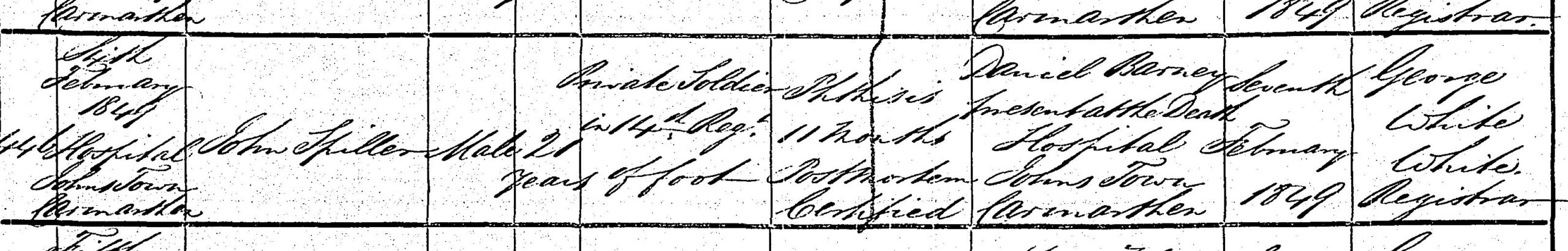 Death Certificate of Private John Spiller.14th Regiment of Foot. 1849 aged 21